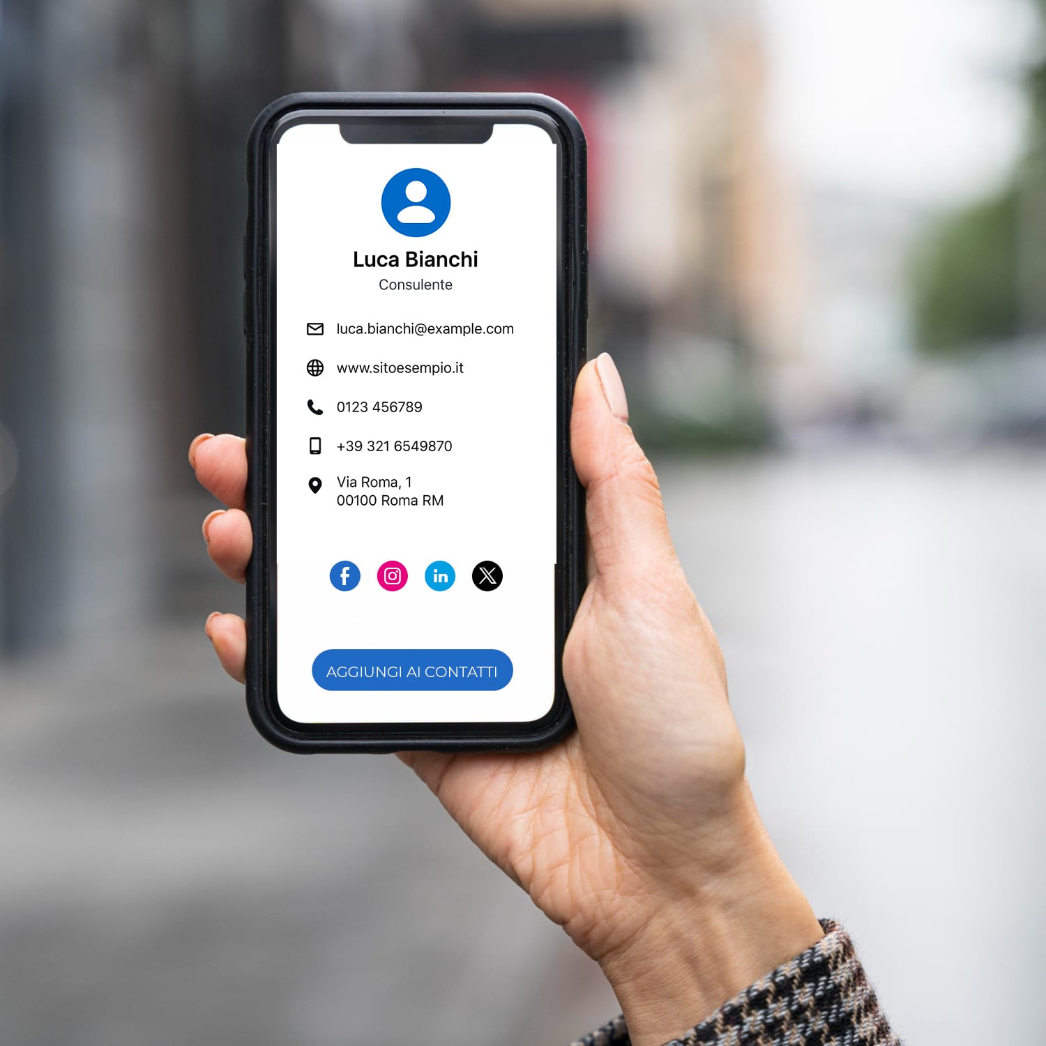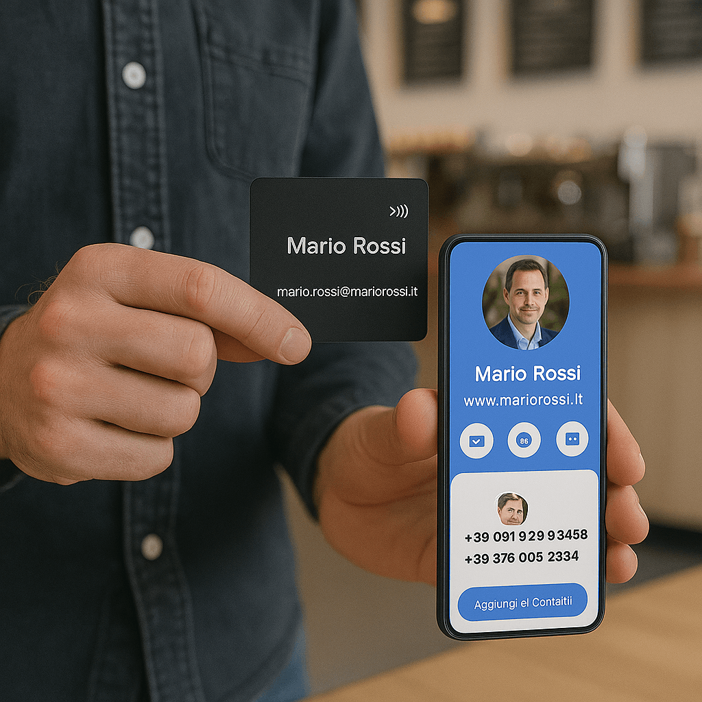 È un biglietto da visita innovativo che utilizza la tecnologia NFC (Near Field Communication) per condividere rapidamente i tuoi dati semplicemente avvicinando lo smartphone.
